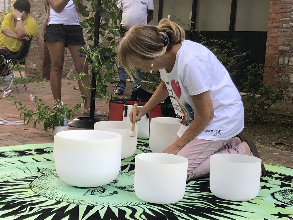 Le campane di cristallo sono composte da quarzo di Silicio al 98,99% e hanno una struttura molecolare molto simile al nostro DNA. Emettono suoni puri e profondi che entrano in risonanza con il nostro corpo fisico ed energetico portando effetti positivi immediati, tra cui un rilassamento profondo e la connessione con la nostra vera essenza, aiutandoci ad elevare lo stato di coscienza. Ogni campana ha un suono legato a ognuno dei 7 Chakra, note uniche e avvolgenti che originano una danza celestiale portatrice di grande benessere, un viaggio alchemico straordinario. Nei miei concerti abbino al potere del suono gli intenti luminosi di tutto il gruppo, e lascio in dono ad ogni partecipante l'adesivo con parole potenzianti per "informare" la bottiglietta d' acqua che ognuno porta con sè. Nel 2023 ho creato il CD "INFORMIAMOCI D'AMORE" che contiene 3 tracce musicali di musica informata, il libricino e l’adesivo per contribuire a diffondere queste vibrazioni a tutto il Pianeta.